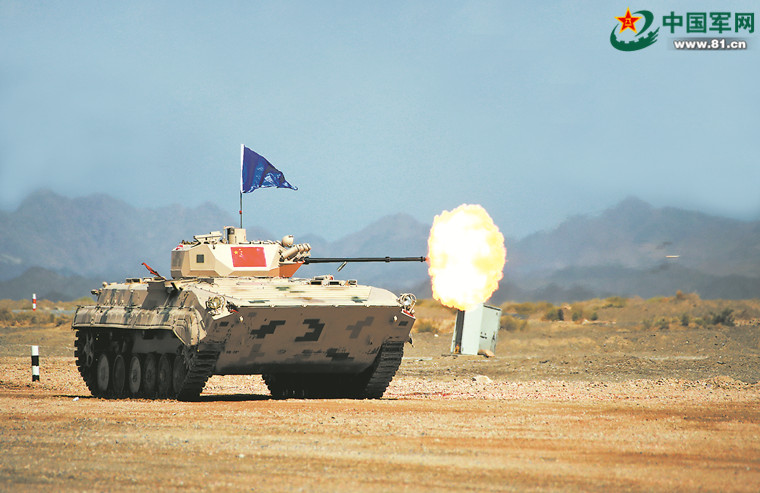 “苏沃洛夫突击”步战车组项目比赛中,中国参赛队步战车进行侧方位射击。袁凯 摄