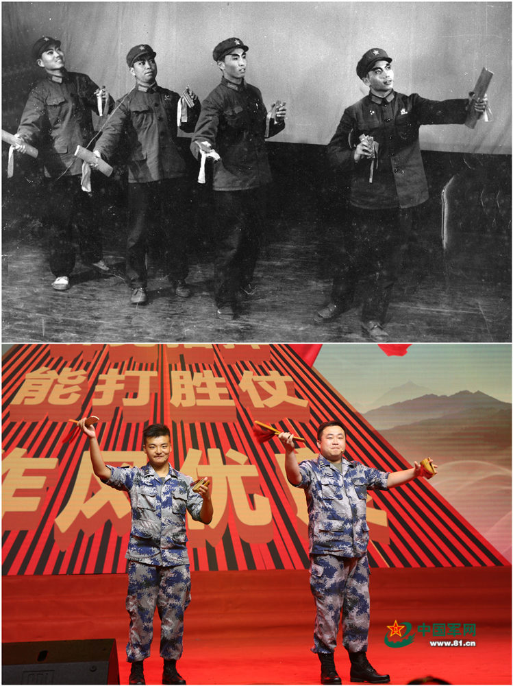 上:70年代,空军地导部队组织文艺汇演,官兵进行快板表演。