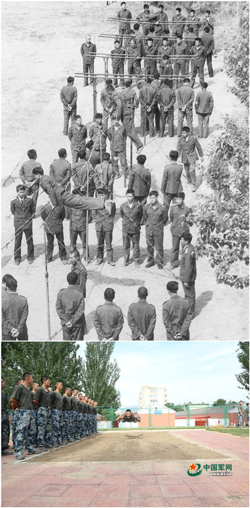 上:60年代,空军地导部队官兵进行军体训练,图为官兵进行单杠训练。