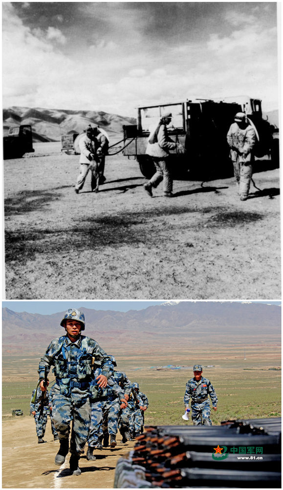 上:70年代,空军地导部队官兵在戈壁滩上架设装备。