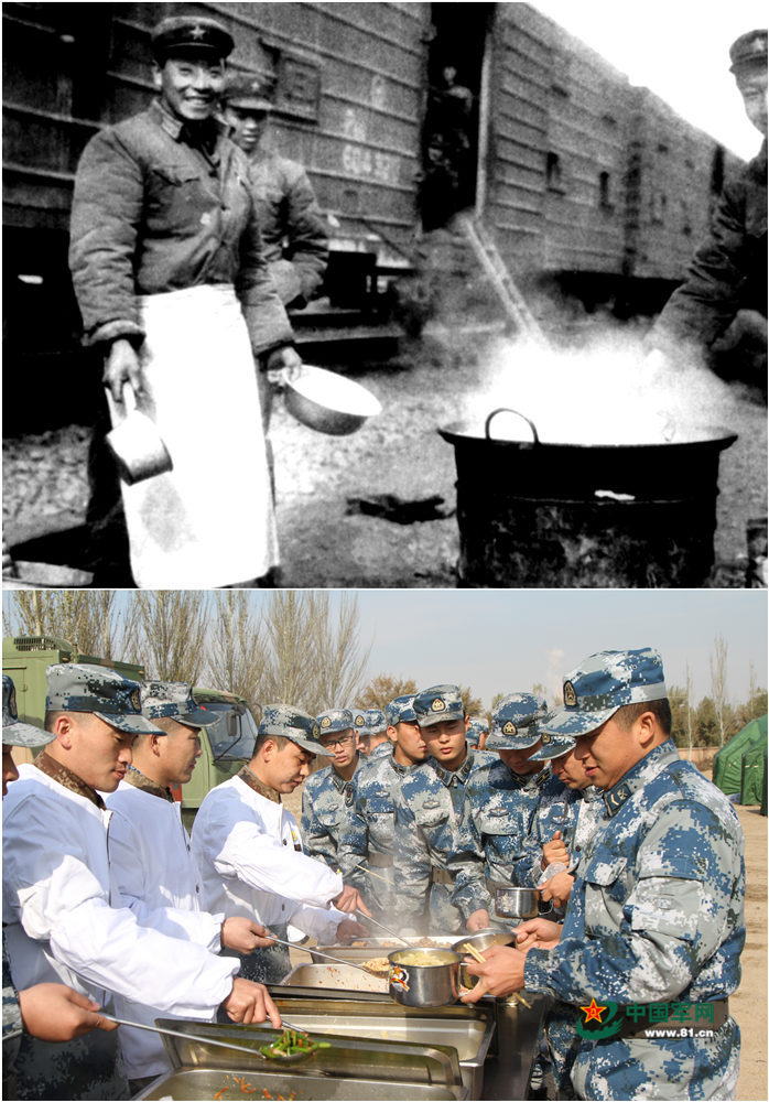 下:2017年,中部战区空军地导某旅演训活动后组织官兵就餐。