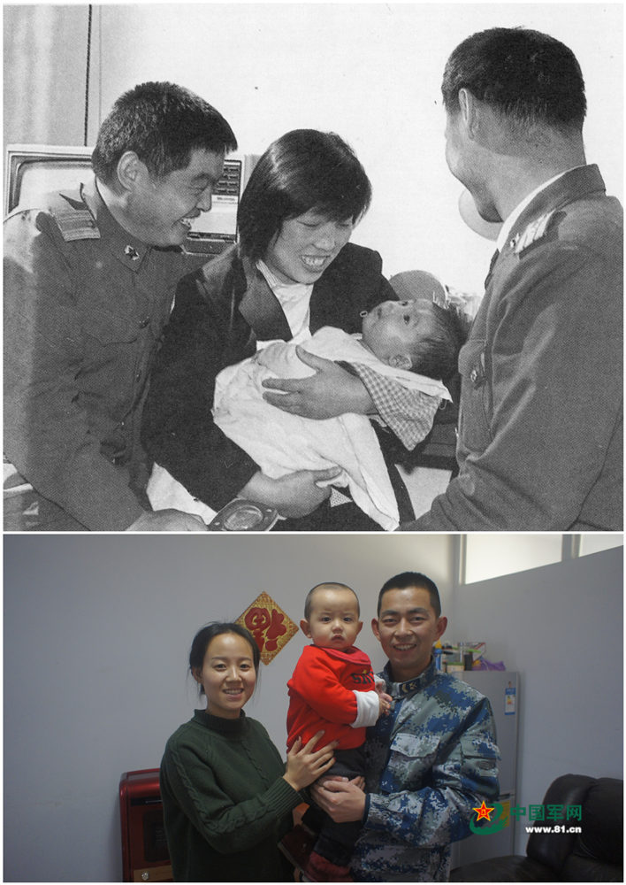 下:2017年,中部战区空军地导某旅官兵家属来队,一家人在军营团聚。