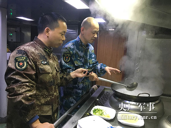 几天的航行,记者注意到,如今舰艇上的伙食已经非常丰富。这些来自全国各地的食物在餐桌上看起来普普通通,但因为包含着亲人的祝福,而有了任何顶级食材也不可比拟的家的味道。吃着自己刚刚做好的鱼丸,政委何坤回忆起母亲给自己带年货的情景。这位四十多岁的军人哽咽了:“我是大年初二一早从家里出发,母亲给我备了一大包年货,以鱼丸为主。带的时候我还嫌母亲拿得太多,我说飞机上面带不了这么多东西,但是心里面想,这是母亲对于儿子的一种寄托,一种心愿,也让我在千里之外能尝到家乡的味道。”