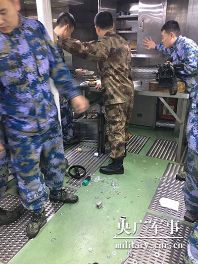 十几秒后,厨房恢复了平静。官兵们将锅碗瓢盆规整到位,回到原先的位置继续做饭。有的官兵拿来扫把,打扫地上摔碎的瓶罐和撒落的食材。何坤说,这样的场景,他们已经司空见惯。