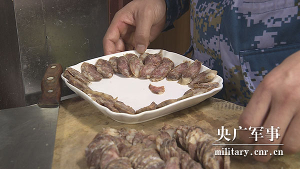 山东烟台籍战士李福晓将家乡的香肠切好摆盘。