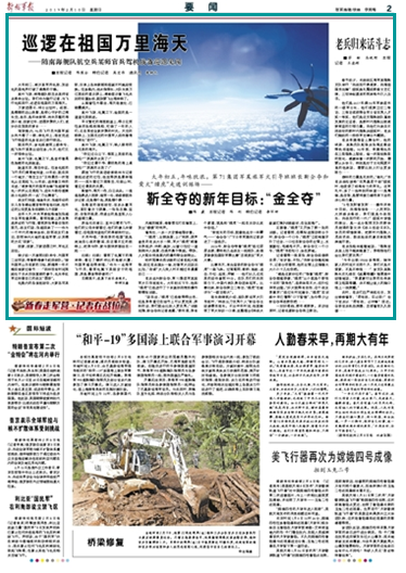 大年初二,南方某军用机场,发动机的轰鸣声打破了清晨的宁静。桨叶飞旋,南海舰队航空兵某师官兵奉命出征。我们作为随行记者,与飞行机组同行,巡逻在祖国的万里海天。请关注今日出版的《解放军报》的详细报道——