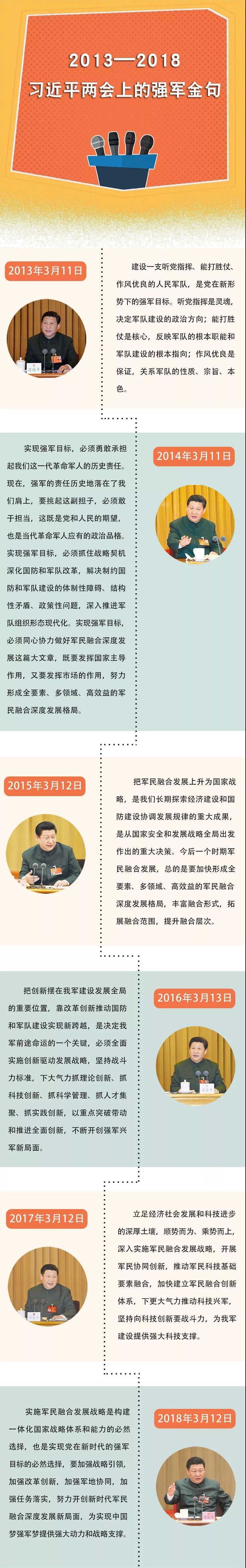 擘画强军蓝图,指引奋进征程。2013年到2018年全国两会期间,中共中央总书记、国家主席、中央军委主席习近平连续出席解放军和武警部队代表团全体会议并发表重要讲话,提出一系列新思想、新论断、新要求——