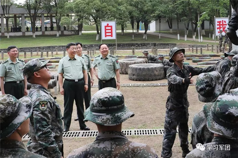 学院训练场上,学员们生龙活虎、喊声震天,一派实战化练兵景象。习近平走到障碍训练场旁,察看学员进行障碍训练情况。极限训练对于锤炼学员体能极限、意志极限、心理极限,提高战场适应能力很有意义。习近平步行进入极限训练场,详细了解有关训练设施和训练情况。学员们进行了阻绝墙跳水、翻越懒人梯、跨越步步高、翻越高墙、攀爬云梯、攀越高空荡木桥、扛圆木等训练。看到学员们摸爬滚打一身泥水,迎着障碍一往无前,习近平很高兴。