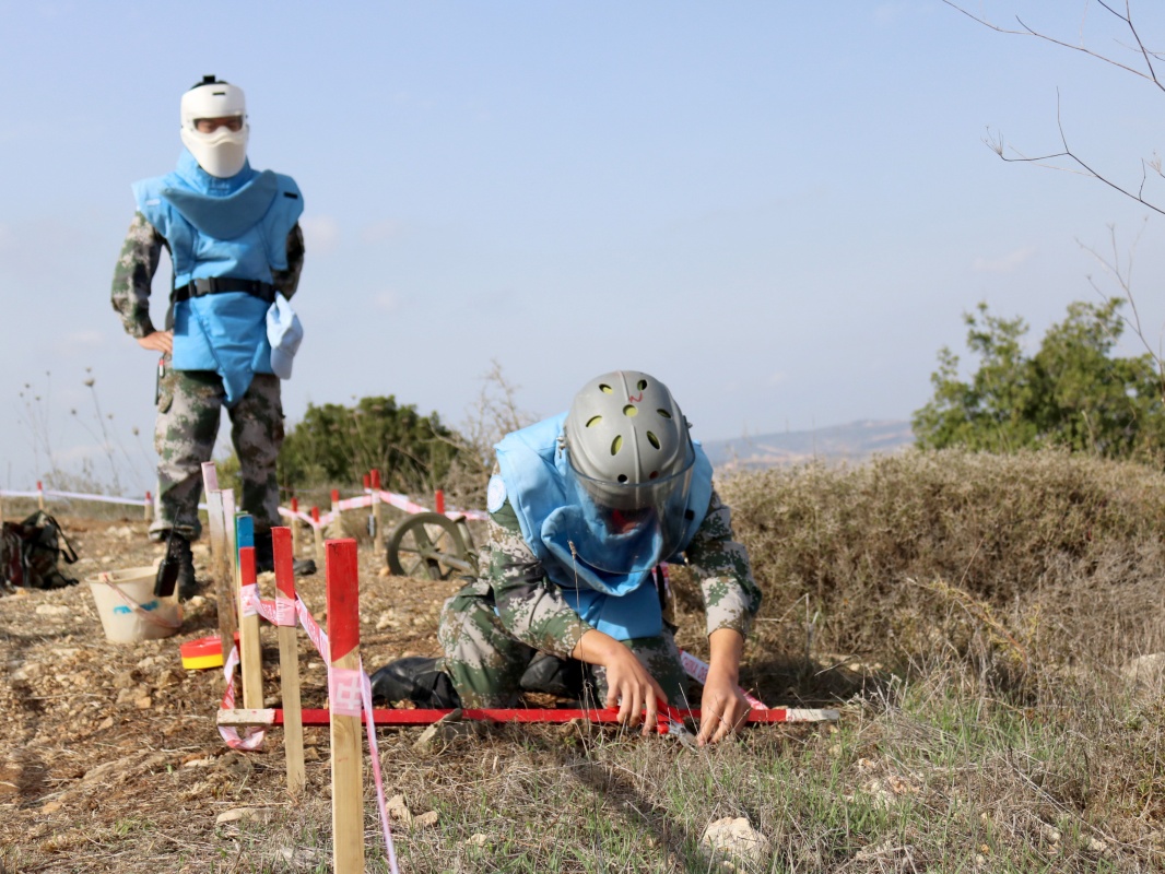 中国维和官兵扫雷作业手在位于黎巴嫩南部靠近以色列边境的“蓝线”附近作业(2017年11月8日摄)。新华社发(董永康 摄)