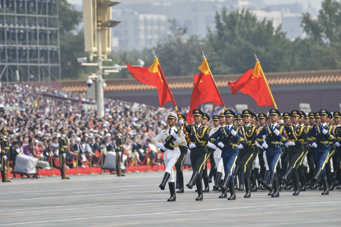 10月1日上午,庆祝中华人民共和国成立70周年大会在北京天安门广场隆重举行。这是行进中的仪仗方队。
