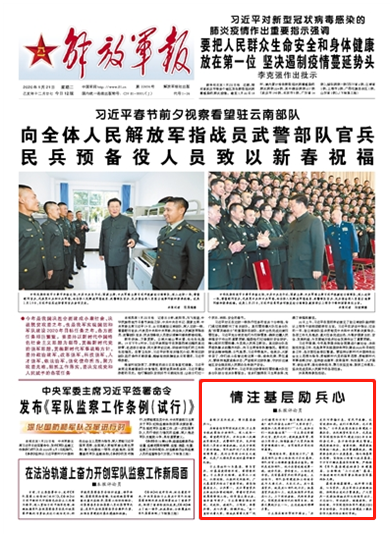 习主席始终心系基层、情系官兵,对基层爱得特别深、看得特别重。习主席多次强调,我军从小到大、从弱到强、从胜利走向胜利,广大基层官兵作出了重要贡献;要坚持基层至上、士兵第一,充分尊重官兵主体地位和首创精神,带着对官兵的深厚感情做工作。任军委主席以来,每年春节前夕,习主席都会抽出时间,走边防、进连队、上哨所,体察兵情、关心兵事、排解兵忧。“我一直惦记着大家,特地来看看大家”“战士们睡觉冷不冷?能不能洗上热水澡?连队伙食怎么样?”“大家辛苦了,祖国和人民感谢你们!”“今天,我和你们一起执勤站岗”……习主席这些暖兵之言、爱兵之行,浸润座座军营,感动三军将士,持续激励广大官兵把强军梦想根植心田,书写强军兴军的壮丽篇章。