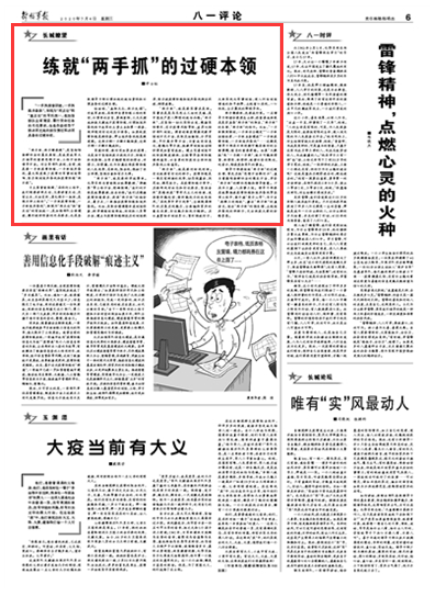 俗话说,“扁担无扎,两头失塌”。对我军来说,在做好自身防控工作的同时,必须牢记宗旨、勇挑重担,义无反顾地积极支援地方疫情防控,必须把练兵备战作为我军的主责主业和第一要务,做好随时打仗的充分准备。如果说疫情防控是硬任务,那么练兵备战则是硬道理。这两头哪一头都不能偏废,这两手哪一手都不能放松。