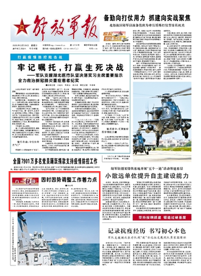 “察势者智,驭势者赢。”如同打仗一样,抗疫斗争发展变化很快。形势一变,对应措施就要变,否则就会失去主动,造成被动。然而,在实际工作中,仍有个别单位跟不上形势变化,存在人员管理“一刀切”、管控措施一成不变、忽视风险评估盲目应对等问题。对军队各级党组织来说,当前最重要的就是要清醒看到国内外疫情形势的复杂性和严峻性,准确把握疫情防控的阶段性变化,及时调整和完善各项应对举措,确保疫情防控工作不松、练兵备战力度不减。