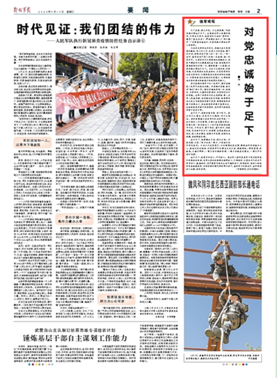 始于足下,就要锲而不舍、持之以恒。对党忠诚,不是一阵子而是一辈子,只有进行时没有完成时。不论今天还是明天,不论顺境还是逆境,都要始终保持滚石上山、爬坡过坎的韧劲,对党和军队的事业矢志不渝、竭诚奉献。像张富清、林俊德、王继才那样,一辈子坚守精神家园、一辈子忠诚党的事业、一辈子严守党的纪律。