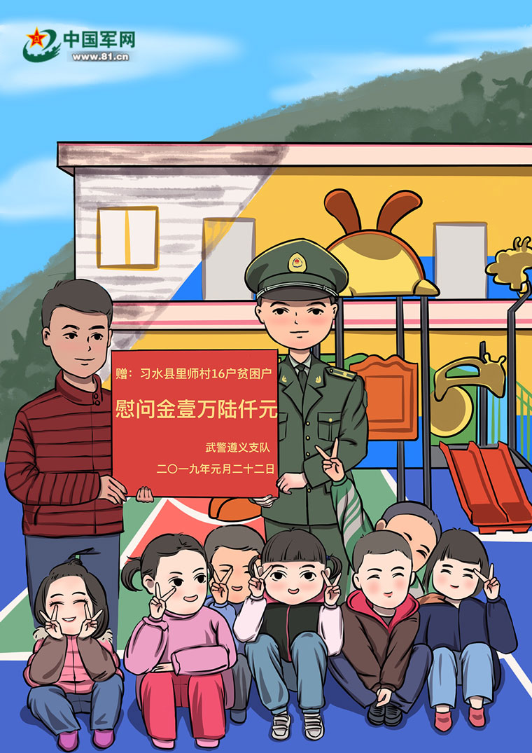 2016年,武警遵义支队将当时贫困人口占总人口数1/5,人均年收入不到2000元,穷得“叮当响”的习水县官店镇里师村确定为支队的定点帮扶村。四年的帮扶时光,武警遵义支队先后投入了240余万元帮扶资金,帮助里师村改建了办公楼、幼儿园和小学,修建了村文化广场,完善了乡镇医疗卫生机构,建成了80亩红心柚示范基地、现代化的大米加工厂,帮助村里形成了“短期增收”和“长期致富”相结合的产业扶贫模式,推动当地扶贫工作由“输血”向“造血”转变。2019年底,全村建档立卡贫困户196户897人彻底摘下了“穷帽子”,迎来了新生活。