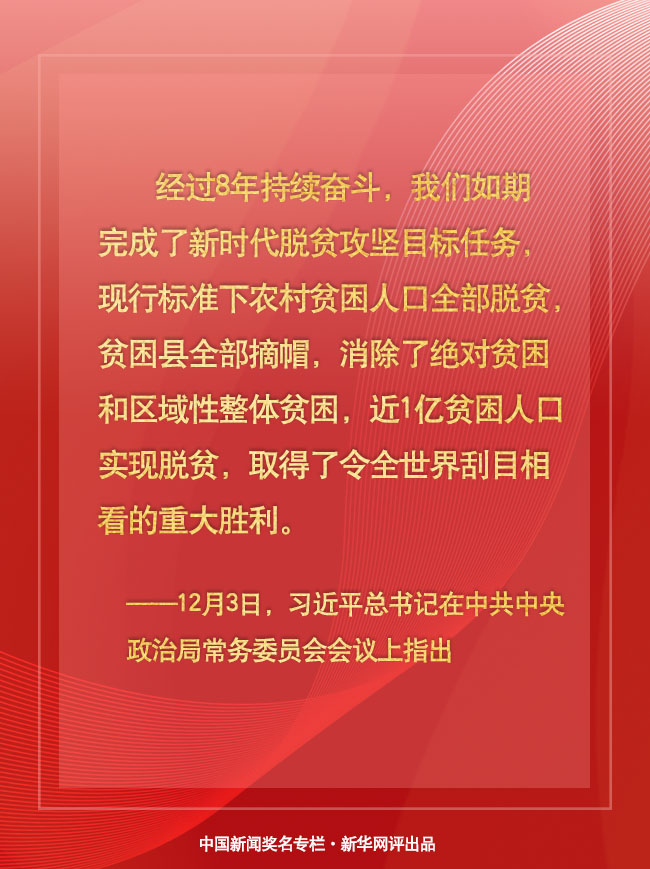 中共中央政治局常务委员会12月3日召开会议,听取脱贫攻坚总结评估汇报。习近平总书记在会上指出,经过8年持续奋斗,我们如期完成了新时代脱贫攻坚目标任务,现行标准下农村贫困人口全部脱贫,贫困县全部摘帽,消除了绝对贫困和区域性整体贫困,近1亿贫困人口实现脱贫,取得了令全世界刮目相看的重大胜利。