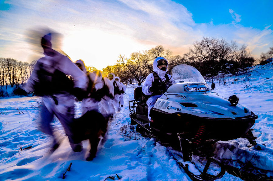 东极哨所官兵组织摩托雪橇和执勤分队进行联合战术演练(11月4日摄)。新华社发(李宝成 摄)