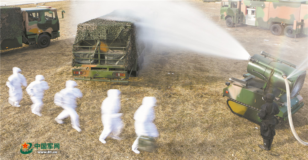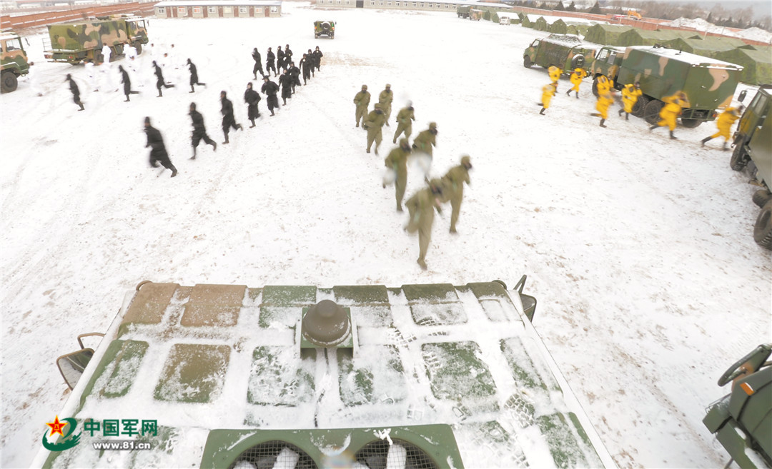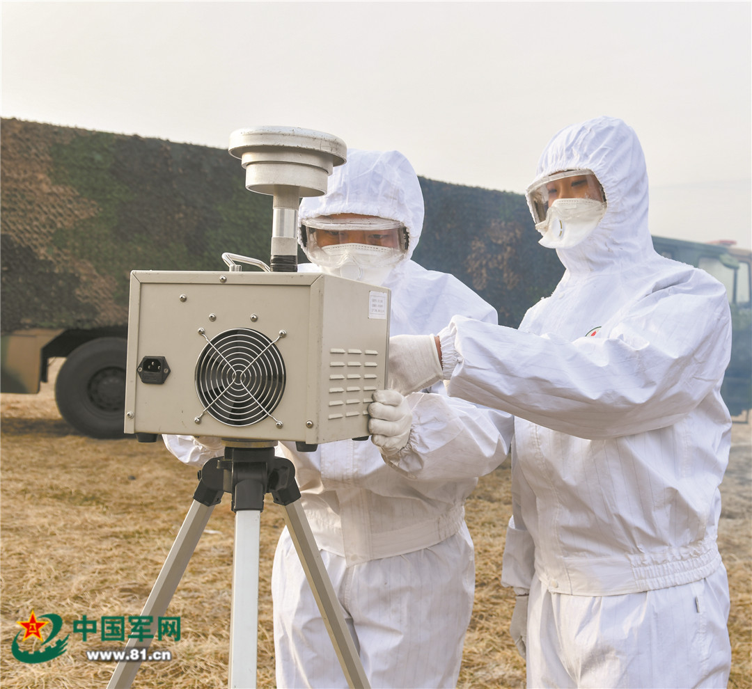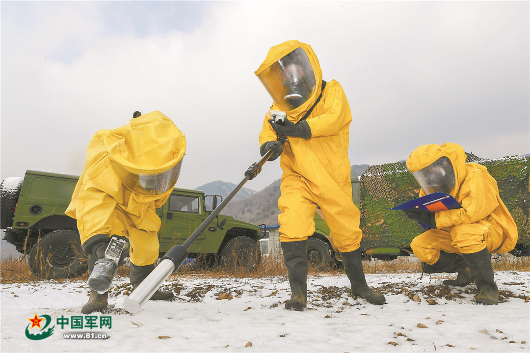 “××地域发生‘放射性沾染’,命令你部立即前往处置!”接到命令后,官兵全副武装迅即出动。“沾染区”现场温度接近-15℃,侦测评估组和压制回收组同步行动,利用新型装备精准采集分析数据,采取多种手段喷射压制去污剂,对“污染源”实施立体封堵和全方位压制。