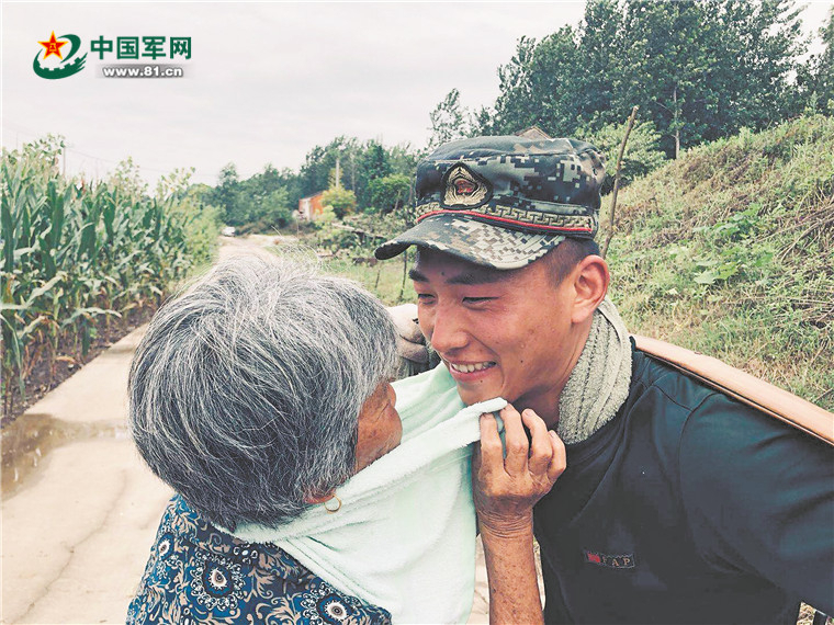 当地老百姓为参加抗洪的战士擦汗。李翔 摄