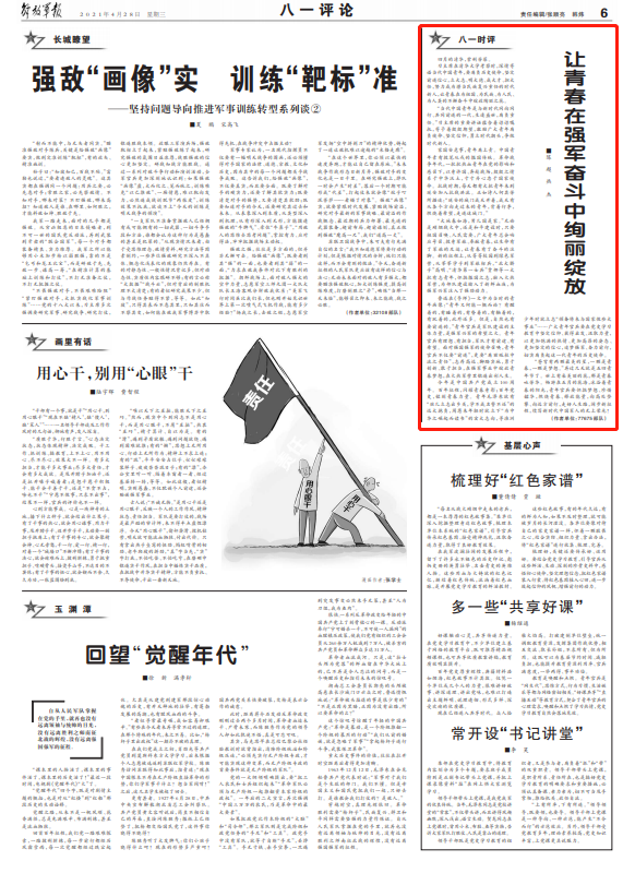 今年是中国共产党成立100周年。百年征程,闪耀青春身影;百年党史,铭刻青春力量。青年毛泽东就有“孩儿立志出乡关,学不成名誓不还”的远大抱负,周恩来年轻时就立下“为中华之崛起而读书”的宏大志向,寻淮洲少年时就立志“预备将来与国家做些大事业”……广大青年官兵要在党史学习教育中坚定信仰、获得启发、汲取力量,以更加饱满的热情、更加高昂的姿态、更加坚定的信心,追梦强军、奋力前行,切实肩负起这一代青年的历史使命。