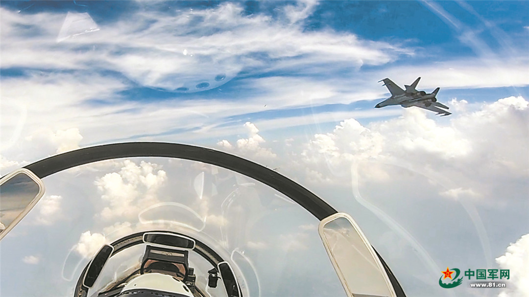 发现目标!僚机飞行员石强立即向长机飞行员李文超通报“敌”机位置,并进行支援性机动,试图从侧翼发起攻击。长机随即与“敌”机缠斗,为僚机进攻创造有利条件。一场复杂环境下的云端对决,在万米高空激烈展开。数个回合后,石强抓住稍纵即逝的“攻击窗口”,果断向“敌”机发出致命一击。