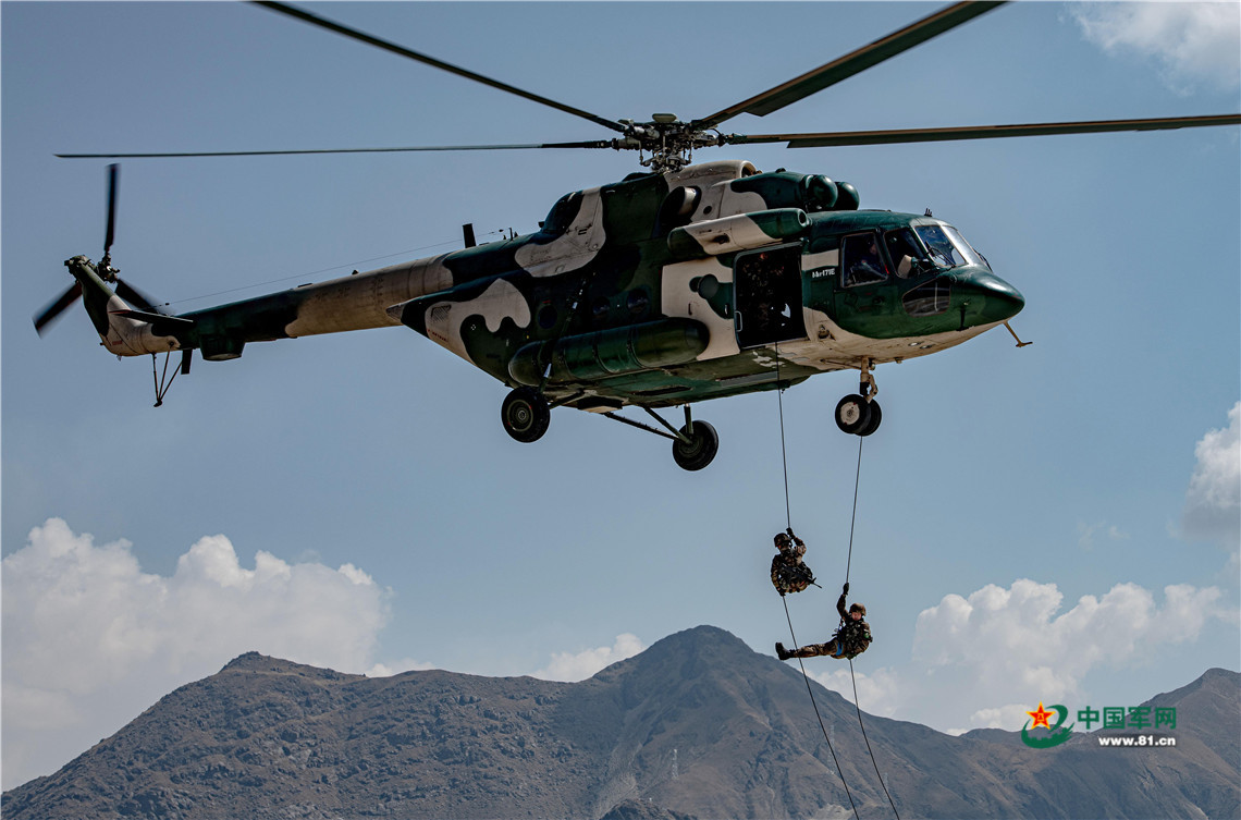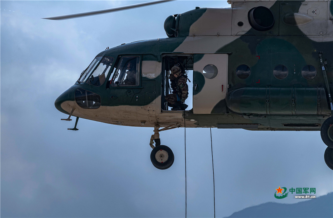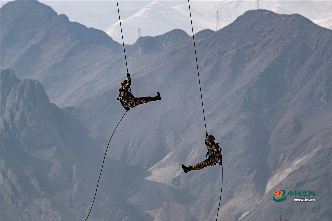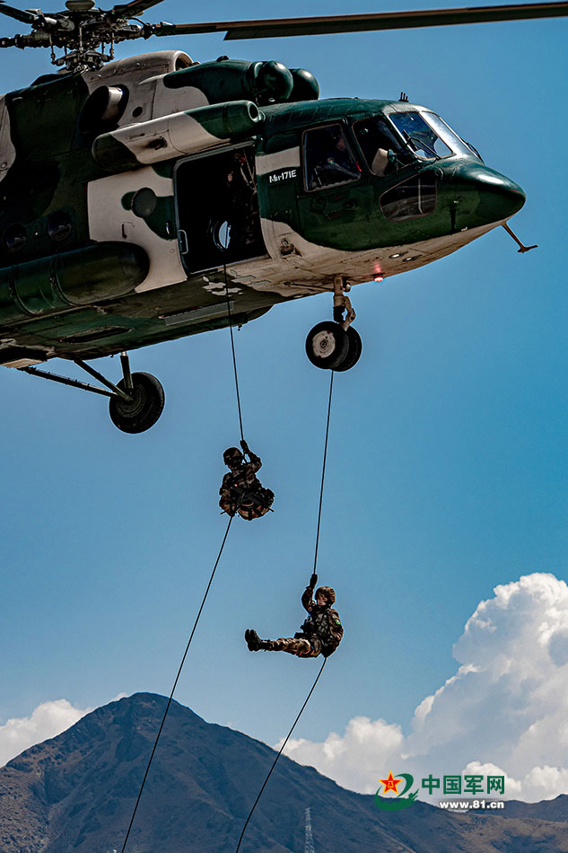 西藏军区某旅女兵分队正在进行机降训练。