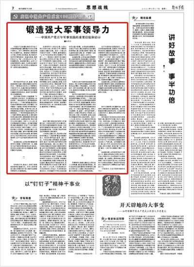 中国共产党波澜壮阔的百年奋斗历程和辉煌成就,凝聚着无与伦比的强大领导力。其中,军事领导力是党的领导力的重要内容。锻造强大军事领导力引领人民军队胜利前进,是中国共产党百年军事实践的一条基本经验,是我们党为什么“能”、人民军队为什么“胜”的重要密码。推进强军事业,必须大力加强军事领导力建设,为实现党在新时代的强军目标、把人民军队全面建成世界一流军队提供坚强保证。