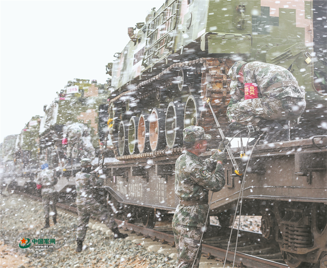 千里机动至演练地域后,官兵顶风冒雪卸载车辆装备。