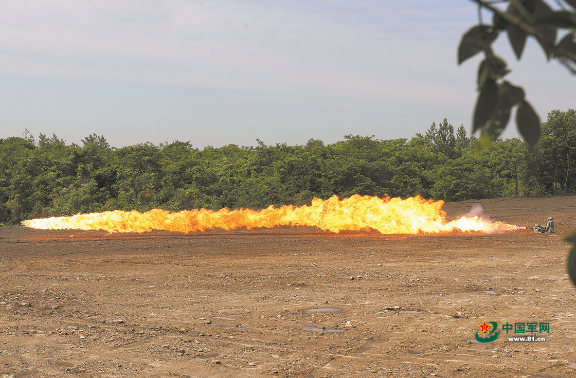 “火龙”直扑目标,喷火兵对障碍实施喷火烧毁。