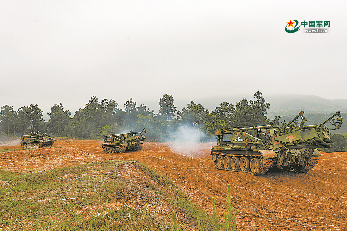 闻令而动,多辆工兵扫雷车组成战斗编组机动前出,交替掩护,快速抵达“敌”阵地前沿混合障碍场。