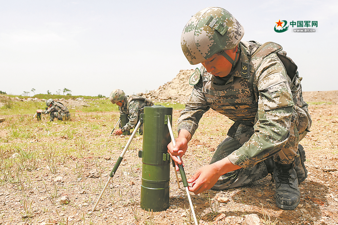 向“敌”混合障碍场发射火箭爆破器。
