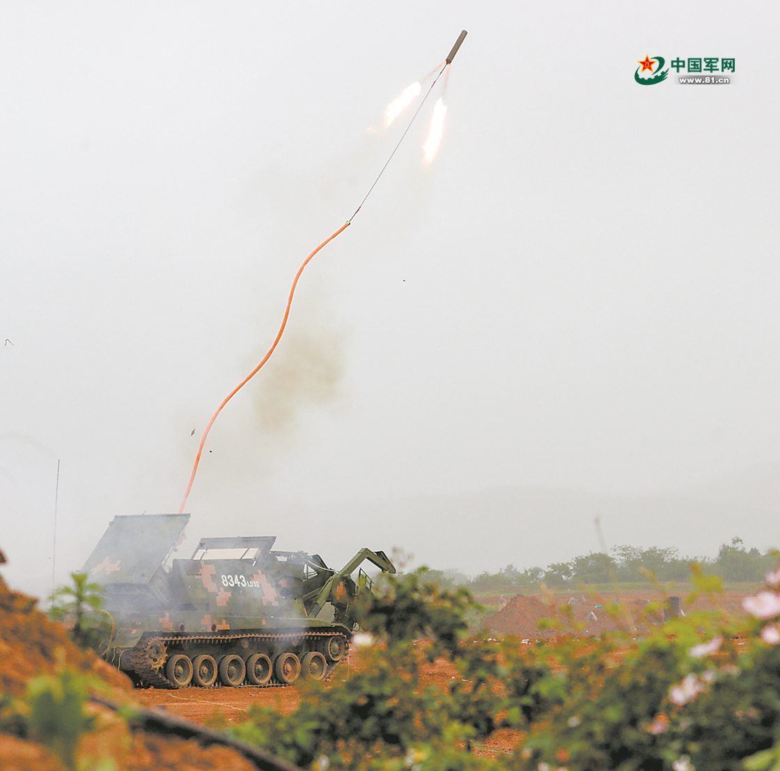 “嗖——”某型火箭爆破器发射升空,准确命中目标。随着爆炸声响起,整个障碍场火光四射,浓烟滚滚。
