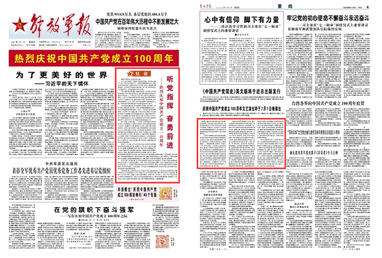 今天,我们迎来了中国共产党百年华诞。百年奋斗换了人间,万里山河气象万千。回望苦难辉煌的过去,守望日新月异的现在,展望光明宏大的未来,我们心潮澎湃、豪情满怀。全军官兵与全党全国各族人民一道,热烈庆祝这个光辉的节日,共同祝福我们伟大的党。
