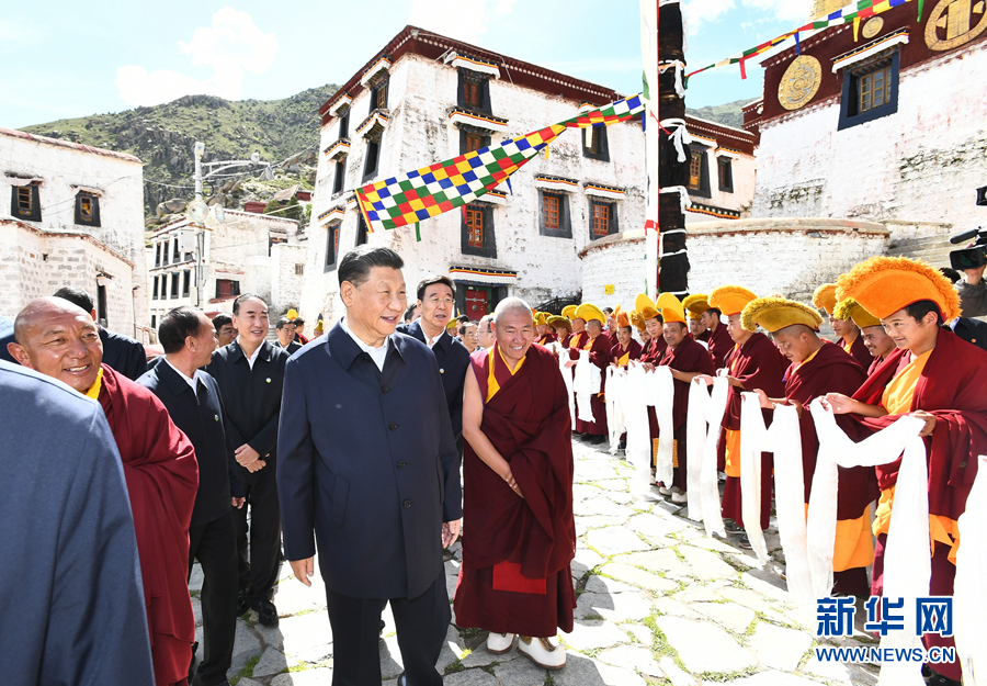 7月21日至23日,中共中央总书记、国家主席、中央军委主席习近平来到西藏,祝贺西藏和平解放70周年,看望慰问西藏各族干部群众。这是22日下午,习近平在位于拉萨西郊的哲蚌寺考察。 新华社记者 谢环驰 摄