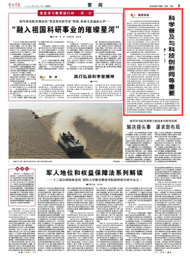 2018年,航天员杨利伟执行飞天任务的《太空一日》被编入人教版七年级下册语文课本。文章详细讲述了他进入太空前后的经历和感受,真实还原了精彩、惊险的飞天过程,极大点燃了青少年对浩瀚太空和未知世界的探究热情。这也启示我们,科普工作相对于科学研究,由于关注对象、承载任务不同,有其自身的特点和规律。各级党委应充分弘扬创新文化、营造创新氛围,引导官兵释放创新潜力、激发创新活力、提高创新能力。开发和用好现有科普场所和设施,寓教于乐、寓教于做,让官兵在亲身体验中感受科技的魅力、创新的乐趣。积极创新科普理念和服务模式,增强科普工作的趣味性、吸引力和感染力,激励广大官兵争当科技创新的推动者和实践者。