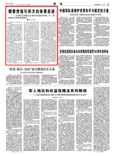八一建军节来临之际,中共中央政治局就坚持党对人民军队绝对领导、奋力实现建军一百年奋斗目标举行第三十二次集体学习,习主席首先代表党中央和中央军委,向全体人民解放军指战员、武警部队官兵、军队文职人员、民兵预备役人员致以节日的祝贺。习主席主持学习并发表重要讲话,站在时代和全局的高度,深刻阐述了实现建军一百年奋斗目标的重大意义,高度评价了人民军队为党和人民建立的不朽功勋,对推进实现建军一百年奋斗目标提出明确要求、作出具体部署,为加快推进国防和军队现代化建设指明了前进方向、提供了根本遵循。