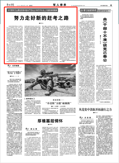 在庆祝中国共产党成立100周年大会上,习主席指出:“过去一百年,中国共产党向人民、向历史交出了一份优异的答卷。现在,中国共产党团结带领中国人民又踏上了实现第二个百年奋斗目标新的赶考之路。”百年奋斗路,启航新征程。赶考之路,是意气风发向着全面建成社会主义现代化强国迈进之路,是为实现中华民族伟大复兴而奋斗的追梦之路。新的赶考之路上,每名共产党员都应不负时代、不负韶华,接续奋斗、砥砺前行,以实际行动向党和人民交出一份满意的答卷。
