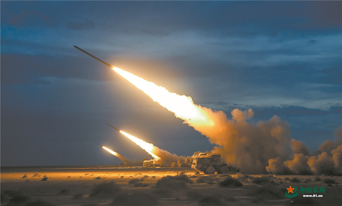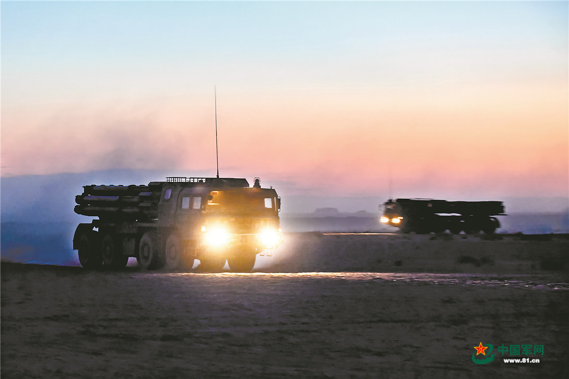 夜幕再次降临,新的“敌”情传来:百里之外的“敌”装甲集群企图发起反击。远火分队即刻机动至发射阵位,数十枚火箭弹划破夜空,又一场激战在大漠深处打响……