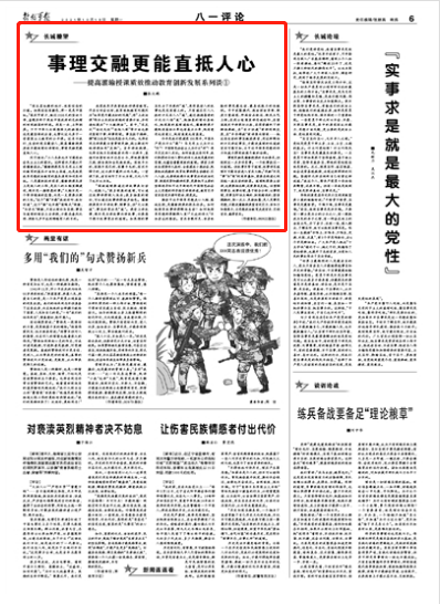 事理交融是灌输授课的目标要求,但做到这一点并非易事。一个故事胜过一打道理。但故事不等于道理,故事讲完道理不可能自动进入官兵大脑。“交融”不是“事”与“理”的简单叠加,需要在两者之间架起一座互动的桥梁。道理既需要主动讲,也需要相互辩,还需要启发悟。注重摆明事实、就事论理,善于综合分析、以事明理,用事实印证正确的、批驳错误的、澄清模糊的,举一反三、见微知著,见人见事见思想,方能使灌输授课富有吸引力、亲和力和感染力,让思想政治教育走进官兵、引领官兵、赢得官兵。
