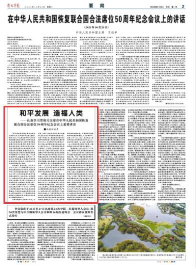 “新中国恢复在联合国合法席位以来的50年,是中国和平发展、造福人类的50年。”习主席出席中华人民共和国恢复联合国合法席位50周年纪念会议并发表重要讲话,回顾中国同联合国携手同行的光辉历程,展现中国对联合国各领域工作作出的突出贡献,总结中国积极参与全球治理体系改革和建设的宝贵经验,就维护多边主义、促进全球发展、团结抗击疫情等重要国际问题阐述中方立场和主张。习主席的重要讲话,高屋建瓴、视野宏大,内涵丰富、思想深邃,必将推动中国同联合国合作迈上新台阶,为世界和平与发展作出新的更大贡献。