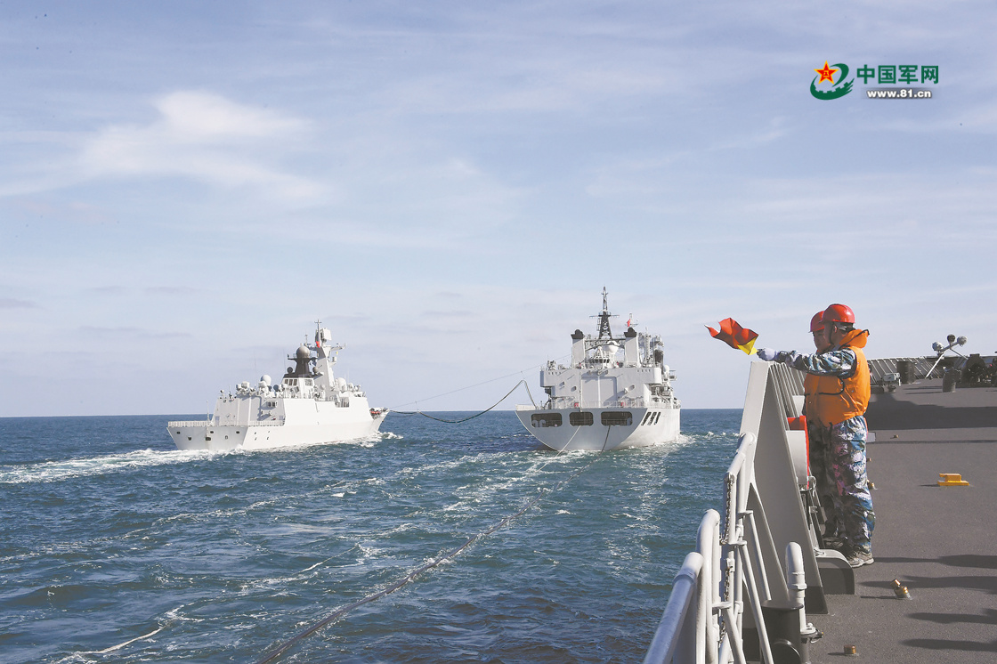 随后,编队转入航行补给训练。训练期间,编队始终保持一艘舰艇实施警戒防御,其余舰艇采取纵向或横向方式连贯接受补给。