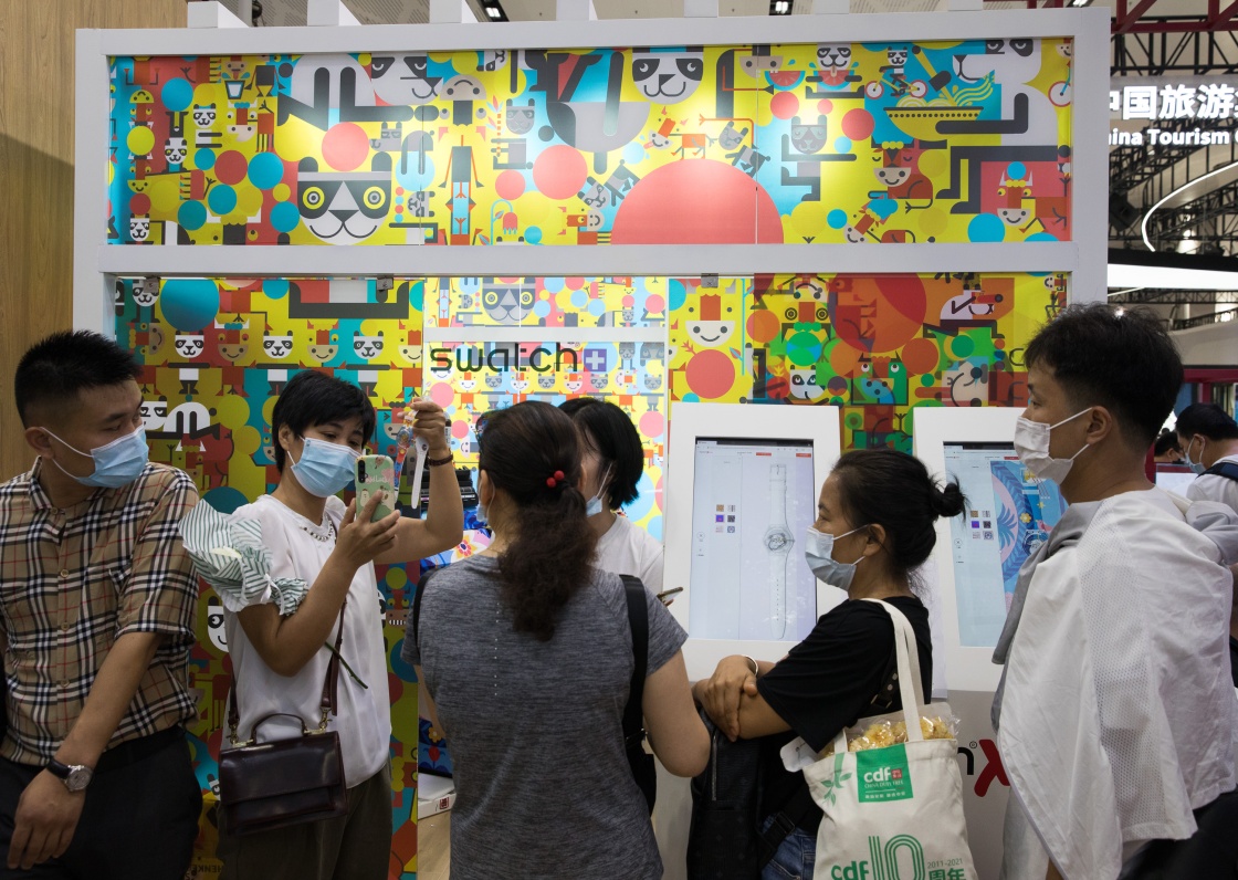 2021年5月10日,参观者在中国海口的消博会时尚生活展区瑞士馆咨询了解个性腕表定制服务。新华社记者 金立旺 摄