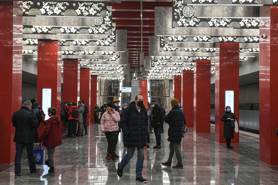 2021年12月7日,在俄罗斯首都莫斯科,乘客走在莫斯科地铁第三换乘环线西南段米丘林大街站内。中企在俄罗斯承建的首个地铁项目——莫斯科地铁第三换乘环线西南段项目当日开通。新华社发(叶甫盖尼·西尼岑 摄)