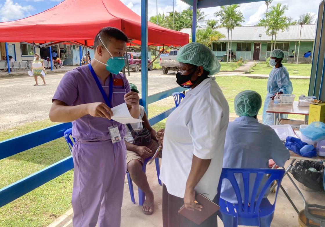 2021年8月25日,在巴布亚新几内亚新爱尔兰省卡维恩总医院,中国援巴新医疗队队员向当地医护人员介绍疫苗接种注意事项。新华社发(中国援巴新医疗队供图)