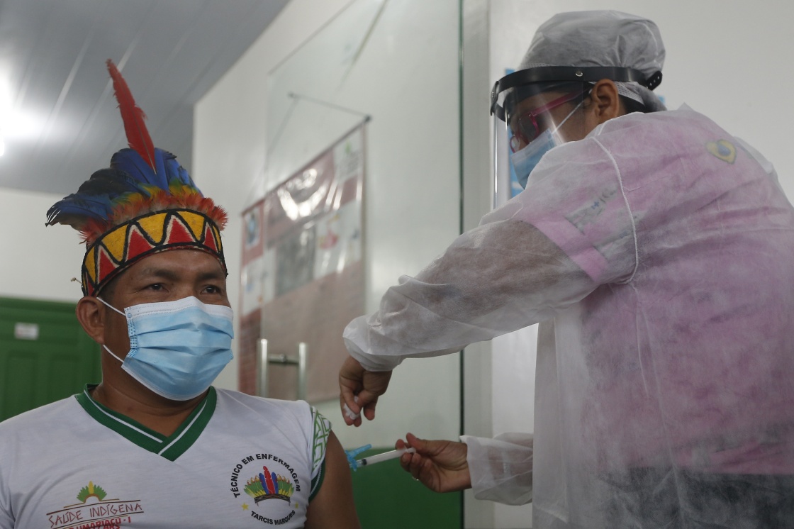 2021年1月19日,在巴西亚马孙州塔巴廷加市,医护人员为一名原住民接种中国新冠疫苗。新华社发(卢西奥·塔沃拉 摄)