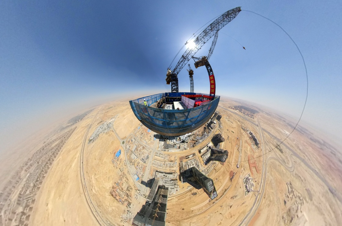 这是2021年6月17日在埃及开罗附近拍摄的埃及新行政首都中央商务区标志塔(全景相机拍摄)。埃及新行政首都中央商务区位于首都开罗以东约50公里处,由中国建筑股份有限公司埃及分公司承建。新华社记者 隋先凯 摄