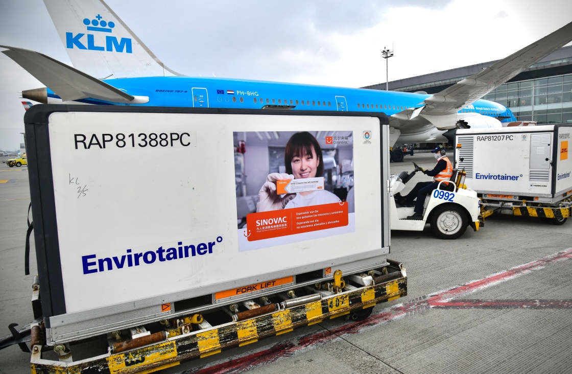 这是2021年3月6日在哥伦比亚波哥大埃尔多拉多国际机场拍摄的刚刚完成卸货的科兴疫苗。新华社发(哥伦比亚总统府供图)