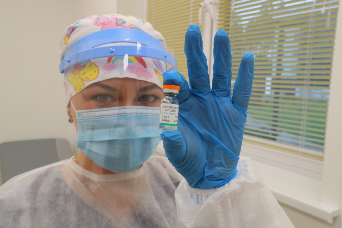 2021年4月16日,在白俄罗斯首都明斯克郊区的中白工业园,医务人员展示中国国药集团生产的新冠疫苗。当日,中白工业园开发公司、管委会及部分居民企业的员工开始接种中国政府援助白俄罗斯的新冠疫苗。新华社发(任科夫 摄)