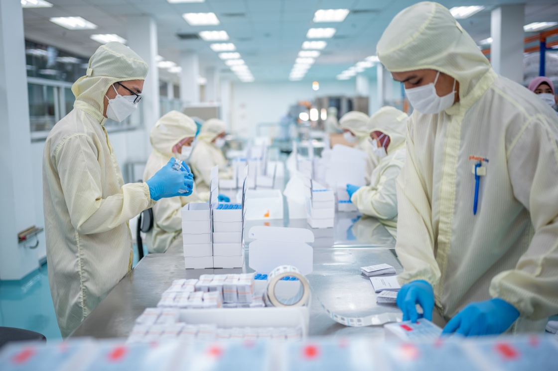 2021年10月5日,在马来西亚吉隆坡郊区的发马公司灌装工厂,工人包装本地灌装生产的中国科兴新冠疫苗。新华社记者 朱炜 摄