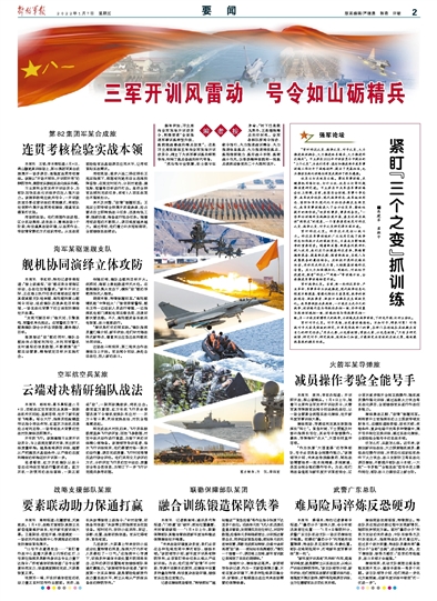 “紧盯科技之变、战争之变、对手之变,大力推进战训耦合,大力推进体系练兵,大力推进科技练兵”。习主席在2022年开训动员令中提出的“三个之变”,为我们思考、谋划和推进新年度军事训练工作打开了战略视野、提出了更高标准,也为推动实战化训练往深里走提供了根本遵循。